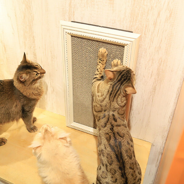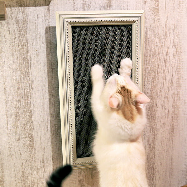 レトロなアンティーク加工が施されたフレームに、爪が研ぎやすいネコ用段ボールをセットにしました。